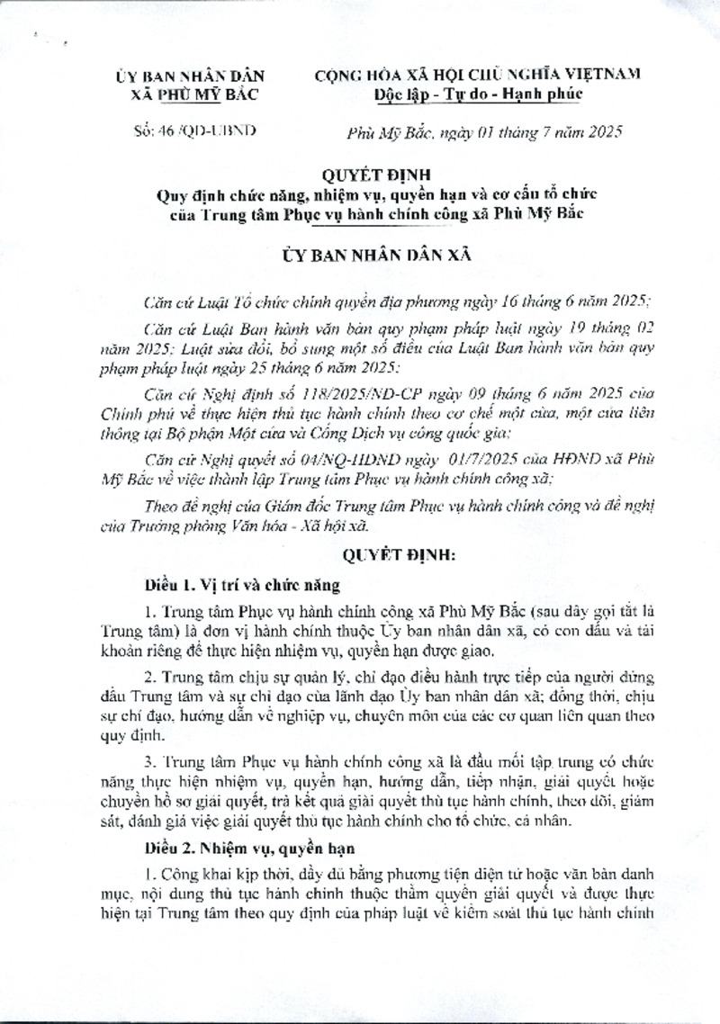| Tiêu đề văn bản | Quyết định quy định chức năng, nhiệm vụ, quyền hạn và cơ cấu tổ chức của Trung tâm Phục vụ hành chính công xã Phù Mỹ Bắc | ||